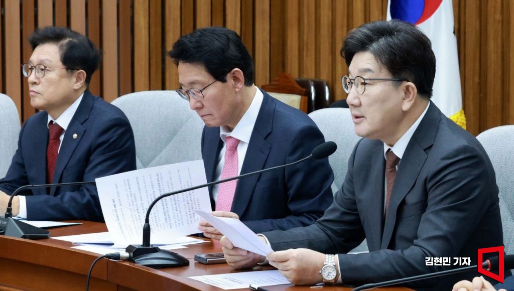 권성동 국민의힘 원내대표가 7일 국회에서 열린 원내대책회의에서 발언하고 있다.