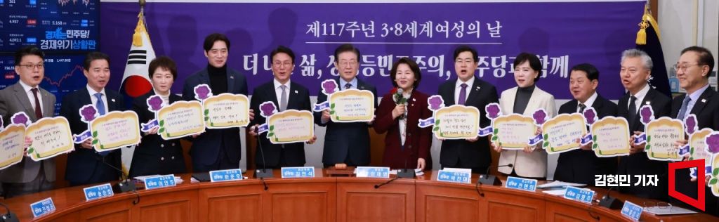 이재명 더불어민주당 대표를 비롯한 지도부가 7일 국회에서 열린 최고위원회의에 앞서 3.8세계여성의날 기념 행사를 하고 있다.