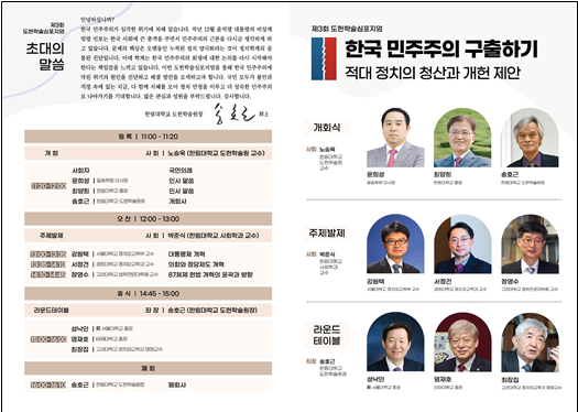 강원택 서울대 교수(정치외교학부)는 '대통령제 개혁'을, 서정건 경희대 교수(정치외교학과)는 '의회와 정당제도 개혁'을, 장영수 고려대 교수(법학전문대학원)는 '87체제 헌법 개혁의 윤곽과 방향'을 주제로 발표한다. 이어 라운드테이블에서는 송호근 도헌학술원장이 좌장을 맡고, ▲성낙인 前 서울대 총장 ▲염재호 태재대 총장 ▲최장집 고려대 명예교수가 패널로 참여해 한국 정치 개혁의 방향을 논의할 예정이다.