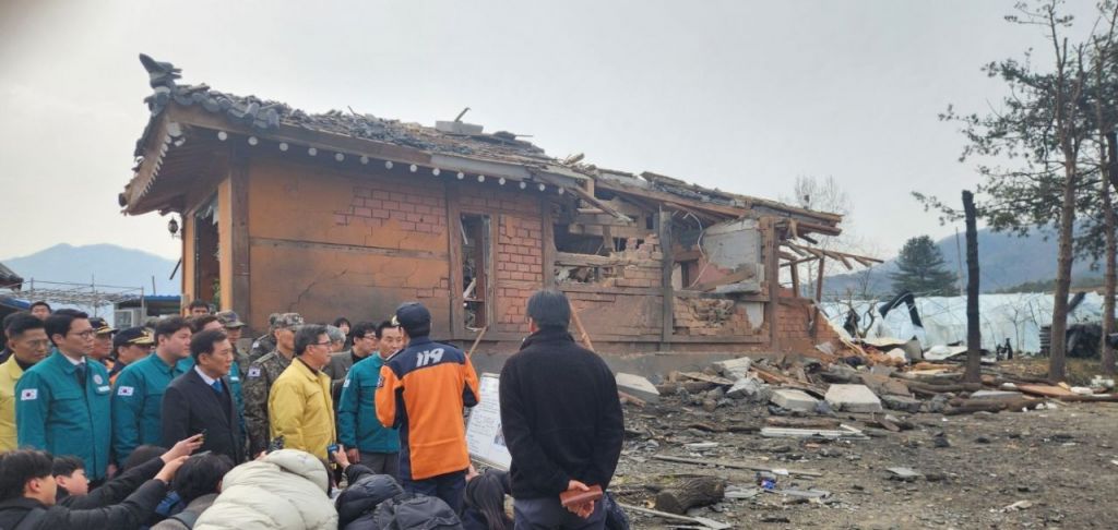김동연 경기도지사가 7일 오후 경기도 포천시 이동면 노곡리 공군 전투기 오폭 사고 현장을 찾아 소방 관계자로부터 피해 상황에 대한 설명을 듣고 있다. 이종구 기자