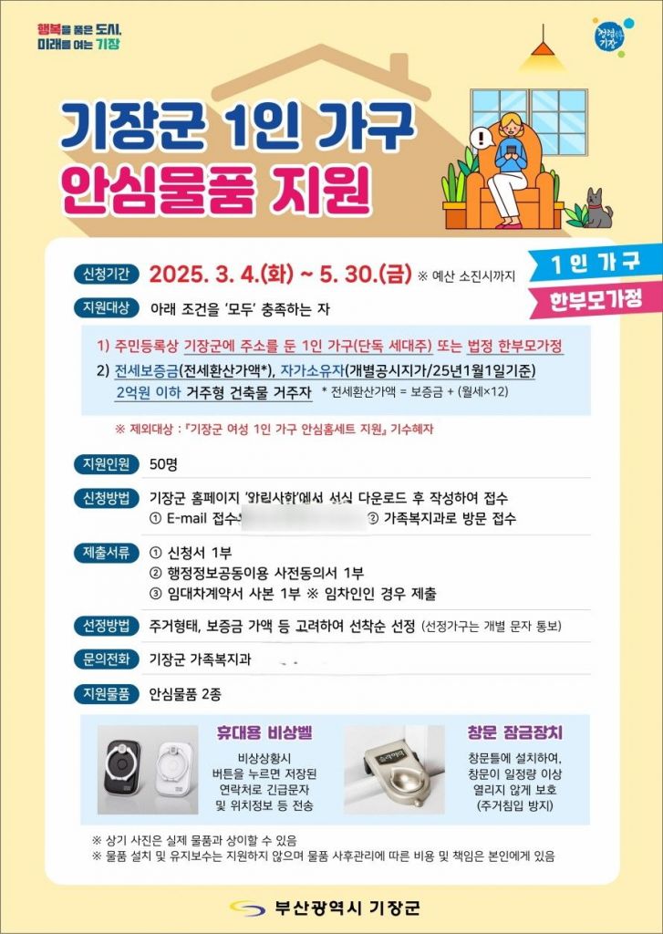 부산 기장군이 1인 가구의 안전한 주거환경 조성을 위해 ‘1인 가구 안심물품 지원사업’을 추진한다.