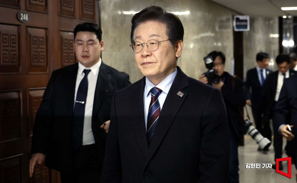 법원이 윤석열 대통령의 구속 취소 청구를 인용한 7일 이재명 더불어민주당 대표가 국회에서 열린 긴급 의원총회에 참석하고 있다.