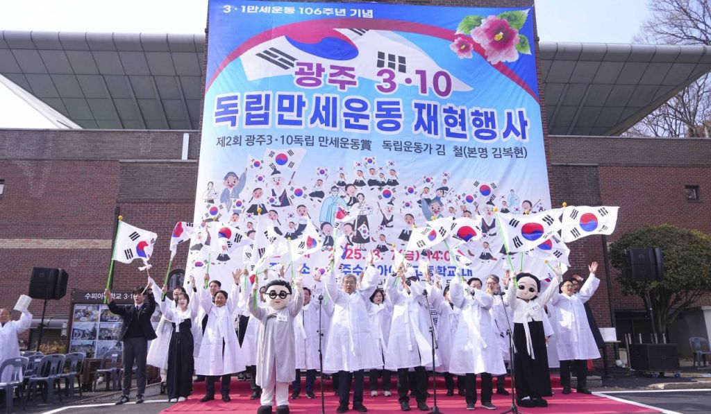 강기정 광주시장이 7일 오후 남구 수피아여고에서 열린 제106주년 3·1절 기념 ‘광주 3·10 독립만세운동’ 재현행사에 참석, 만세삼창을 하고 있다. 광주시 제공
