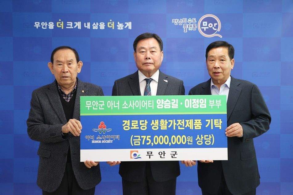 전남 무안군(군수 김산)은 7일 아너소사이어티 양승길·이정임 부부가 경로당 이용 어르신들의 편의 제공을 위해 7,500만원 상당의 생활가전제품을 기탁했다고 밝혔다.