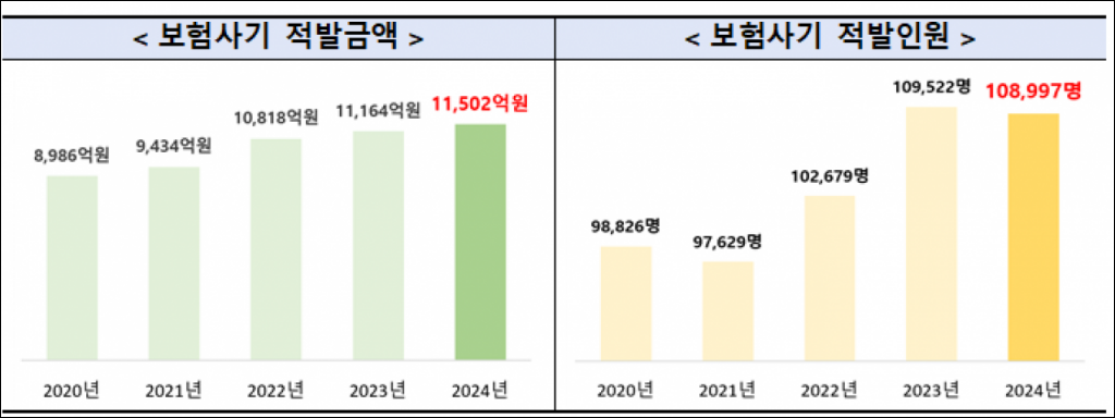 금융감독원은 지난해 보험사기 적발금액이 1조1502억원으로 전년(1조1164억원)대비 3% 증가했다고 9일 밝혔다. 보험사기 적발금액은 2022년 최초로 1조원을 돌파한 뒤 꾸준히 상승하는 추세다. 지난해 보험사기 적발인원은 10만8997명으로 전년대비 0.5% 감소했다.