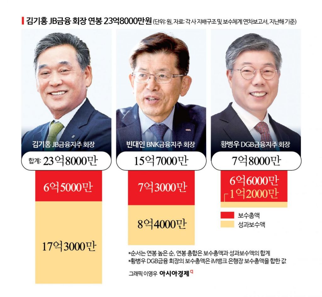 지난해 사상 최고실적을 기록한 지방금융지주(BNK·DGB·JB) 회장들이 수십억원의 연봉을 받은 것으로 나타났다. 김기홍 JB금융지주 회장은 4대 금융지주(KB·신한·하나·우리) 회장보다 더 많은 보수를 수령했다. 임직원 보수가 가장 높은 곳은 지방금융지주는 JB금융으로, 평균 1억7000만원을 받은 것으로 조사됐다.