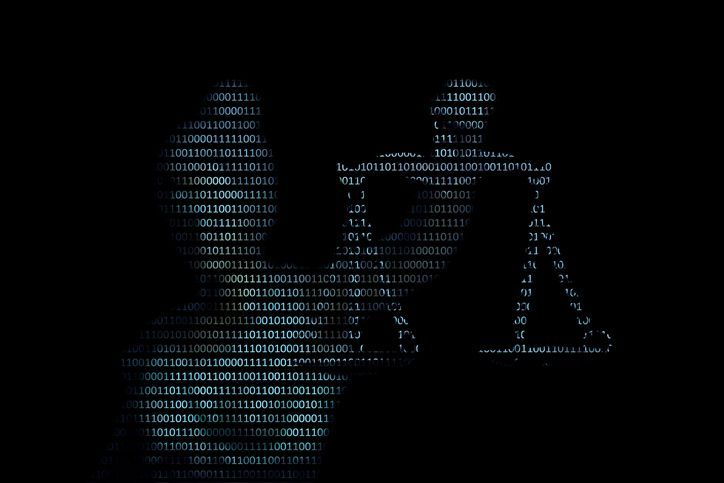 저울을 한 손에 든 사람의 실루엣이 검은 배경 속에 드러나 있고, 실루엣 안은 디지털을 상징하는 0과1로 채워져 있다. 게티이미지뱅크