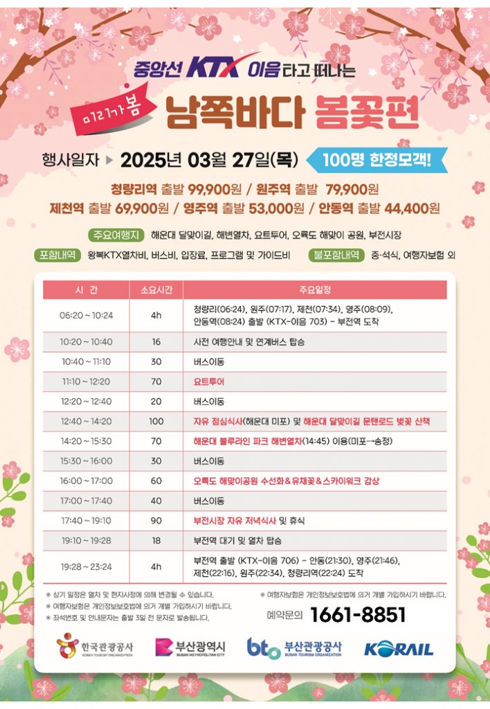 부산에 도착 후에는 요트투어, 해운대 달맞이길 문탠로드 벚꽃산책, 블루라인파크 해변열차 탑승, 오륙도 해맞이공원 수선화·유채꽃 감상 등을 통해 부산의 봄꽃을 만끽할 수 있다. 회당 100명씩 모집하며, 자세한 내용은 코레일톡, 레츠코레일 누리집 등에서 확인할 수 있다.