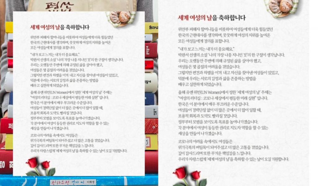 당시 문 전 대통령은 “위안부 피해자 할머니들을 비롯하여 여성들에게 더욱 힘들었던 한국의 근현대사를 생각하며, 꿋꿋하게 여성의 지위를 높여온 모든 여성에게 경의를 표한다”며 “여성이 동등한 권리로 지도자 역할을 할 수 있는 세상을 만들겠다”고 글을 올렸다.