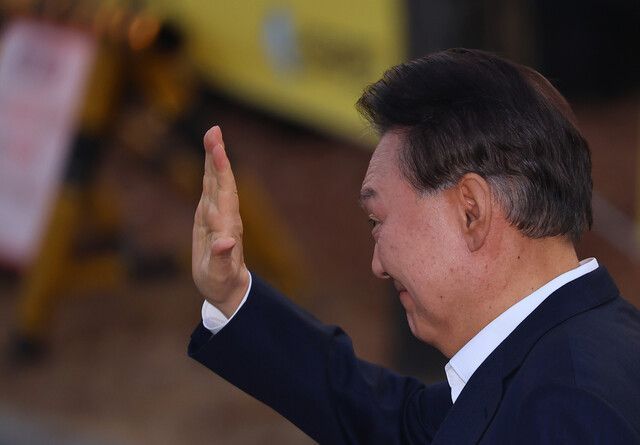 8일 석방된 윤석열 전 대통령이 경기도 의왕시 서울구치소 앞에서 경호 차량에서 내려 지지자들에게 인사하고 있다. 연합뉴스