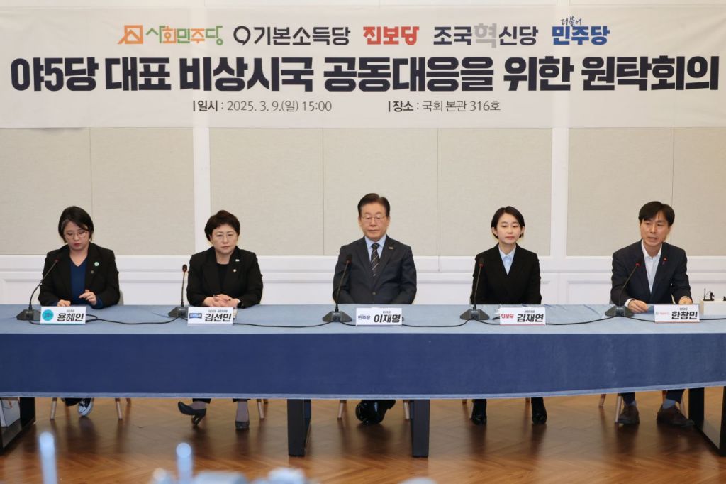 아울러 야당 5당은 헌법재판소에 윤 대통령에 대한 신속한 파면 선고를 촉구하기로 했다. 윤 대통령 파면 때까지 시민사회가 여는 장외 집회에 참여하는 등 긴밀히 연대하기로 했다.