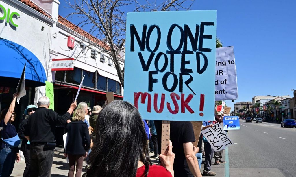 미국 캘리포니아 테슬라 매장 앞에서 '머스크 반대' 시위 벌이는 시민들. AFP·연합뉴스