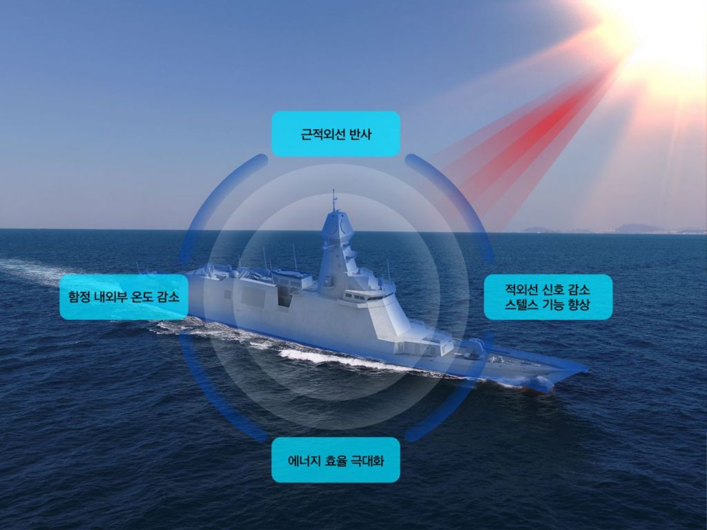 현재 글로벌 주요 방산 선진국들은 운용 중인 함정의 스텔스 성능을 개선하기 위해 선체에서 발생하는 적외선 신호를 줄이는 고내후성 차열도료를 표준으로 채택하고 있다.