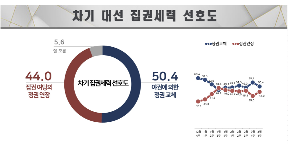 정권교체 찬반 의견도 좁혀졌다. '차기 집권 세력 선호도'를 묻는 질문에 '야당에 의한 정권 교체'를 택한 비율은 50.4%로 '집권 여당의 정권 연장' 44.0%보다 비해 6.4%포인트 높았다. 지난주 같은 조사에서는 정권교체는 55.1%, 정권연장은 39.0%였었다.