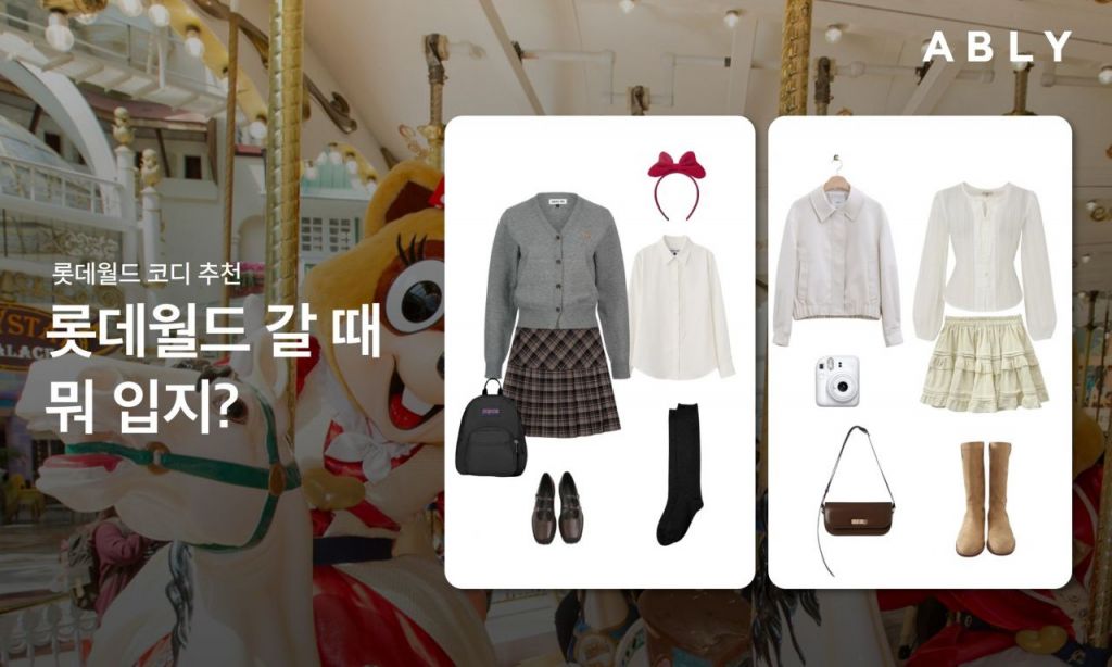 에이블리에 따르면 지난달 에이블리 내 '롯데월드 코디' 검색량은 전년 동기 대비 40%가량 증가했다. '롯데월드 치마'(32%), '롯데월드 룩'(20%) 등도 검색이 늘며 높은 수요를 보였다.