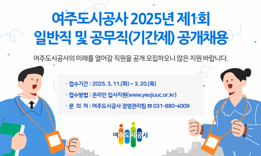 경기 여주도시공사는 2025년 제1회 일반직 및 공무직, 기간제 공개 채용을 실시한다고 10일 밝혔다. 이번 채용은 일자리 창출과 공사의 미래 발전을 이끌 인재를 모집하기 위해 진행되며 총 19명의 인재를 채용할 계획이다
