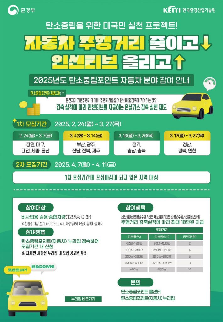 ‘자동차 탄소중립 포인트제’는 비사업용 휘발유, 경유, 액화석유가스(LPG) 승용·승합 차량(12인승 이하)을 대상으로 주행거리 감축량에 따라 연간 최대 10만원의 인센티브를 지급하는 수송 분야 온실가스 감축 실천 사업이다.