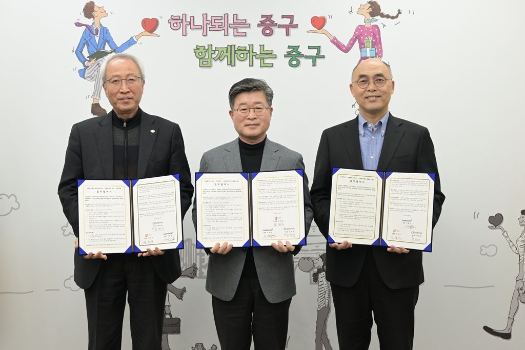 락앤락은 중구청·밀알복지재단과 한부모 가족 지원을 위한 3자 업무협약을 체결했다. 왼쪽부터 밀알복지재단 정형석 상임대표, 김길성 중구청장, 안성일 락앤락 전무. 락앤락 제공