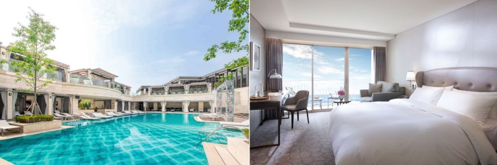 파라다이스시티_'아웃도어 풀'(왼쪽)과 파라다이스 호텔 부산 '디럭스 오션 테라스' 객실. 파라다이스 호텔앤리조트 제공
