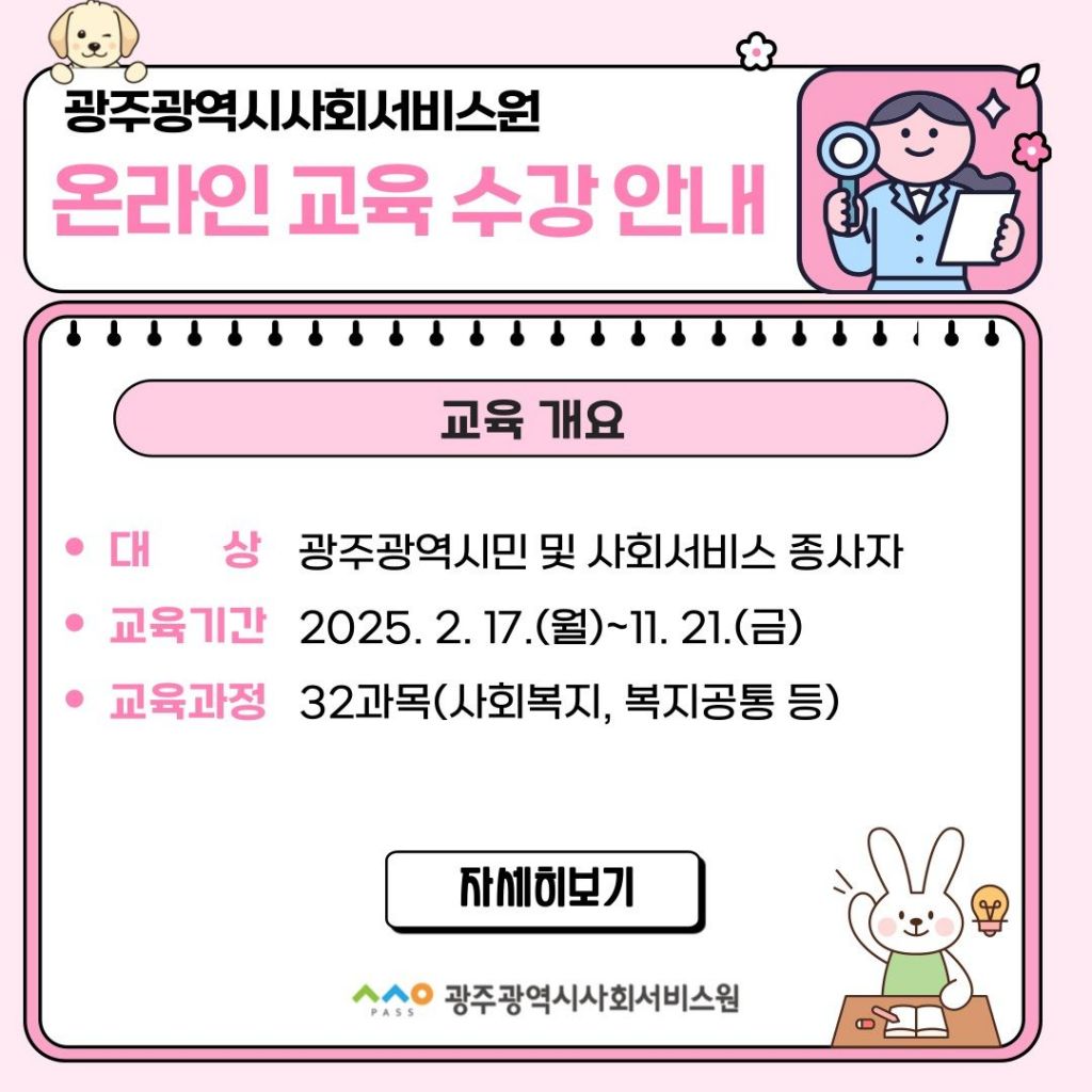 수강 신청은 광주사회서비스원 누리집 ‘온라인 교육’ 메뉴에서 원하는 과목을 신청하면 되고, 신청 후 3주 내 수강해 수료증을 출력할 수 있다.