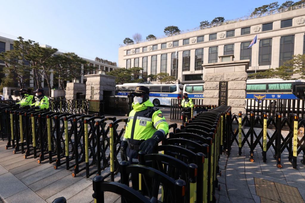 경찰이 지난 6일 윤석열 대통령 탄핵 심판의 선고를 남겨둔 상황에서 서울 종로구 헌법재판소 앞에 바리케이드를 설치했다. 연합뉴스