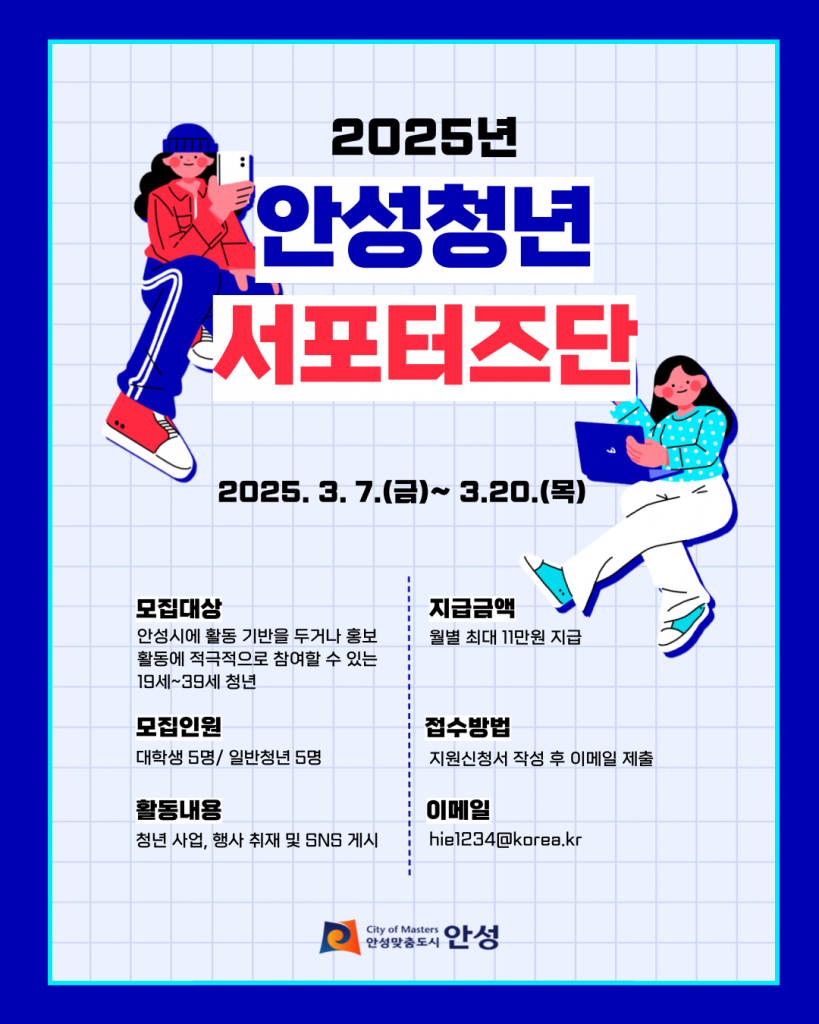 경기도 안성시는 청년층 대상 홍보 강화와 청년사업 및 행사에 대한 참여와 관심을 확대하기 위해 '2025년 안성청년 서포터즈단'을 20일까지 모집한다.