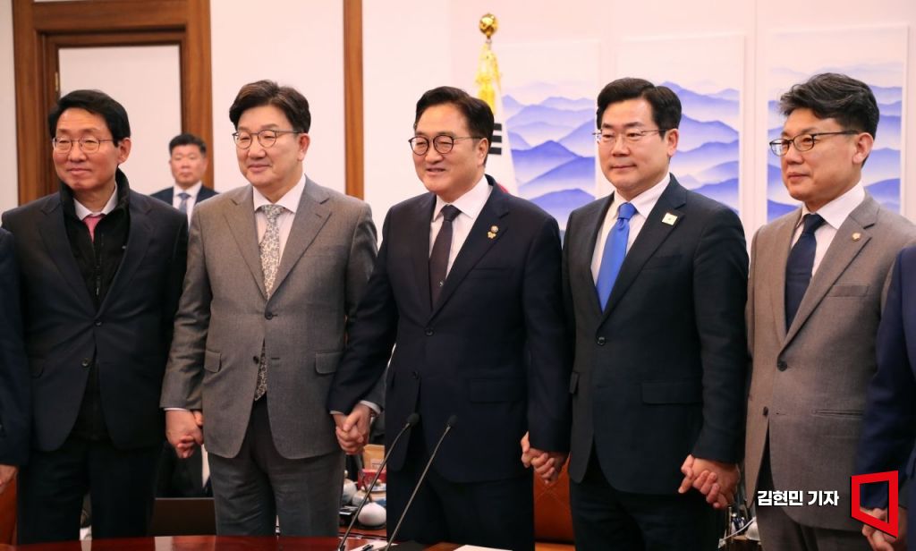 6일 국회에서 열린 여·야 국정협의회에서 참석자들이 손을 맞잡고 있다. 왼쪽부터 국민의힘 김상훈 정책위의장, 권성동 원내대표, 우원식 국회의장, 더불어민주당 박찬대 원내대표, 진성준 정책위의장. 2025.3.6 김현민 기자