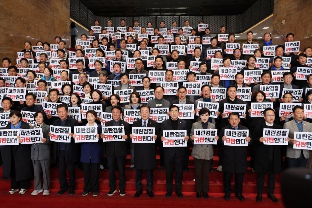 더불어민주당 이재명 대표와 박찬대 원내대표를 비롯한 의원들이 9일 서울 여의도 국회에서 비상 의원총회를 마치고 본청 계단에서 윤석열 대통령을 석방한 검찰을 규탄하는 구호를 외치고 있다. 연합뉴스