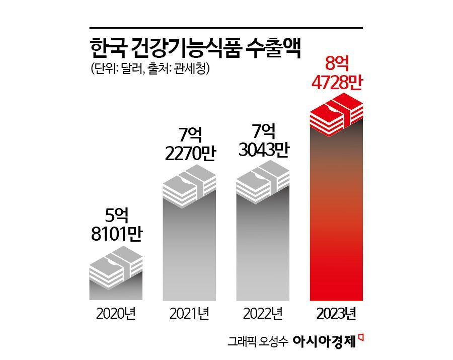 11일 업계에 따르면 전 세계적으로 웰니스 트렌드가 확산하며 국내 건기식 제품의 해외 수출이 가파르게 성장하고 있다. 관세청의 집계 결과를 보면 우리나라 건기식 수출액은 2020년 5억8101만 달러(약 8477억원)에서 2021년 7억2270만 달러(약 1조544억원), 2022년 7억3043만 달러(약 1조657억원), 2023년 8억4728만 달러(약 1조2361억원)로 늘었다.