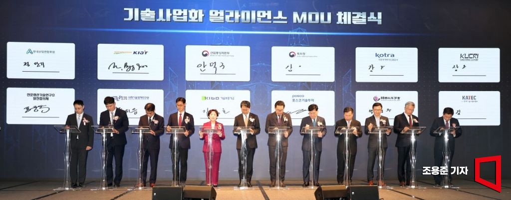안덕근 산업통상자원부 장관을 비롯한 참여 기관장들이 10일 서울 동대문 JW메리어트동대문에서 열린 2025 기술사업화 얼라이언스 출범식에서 MOU 체결식을 갖고 있다.