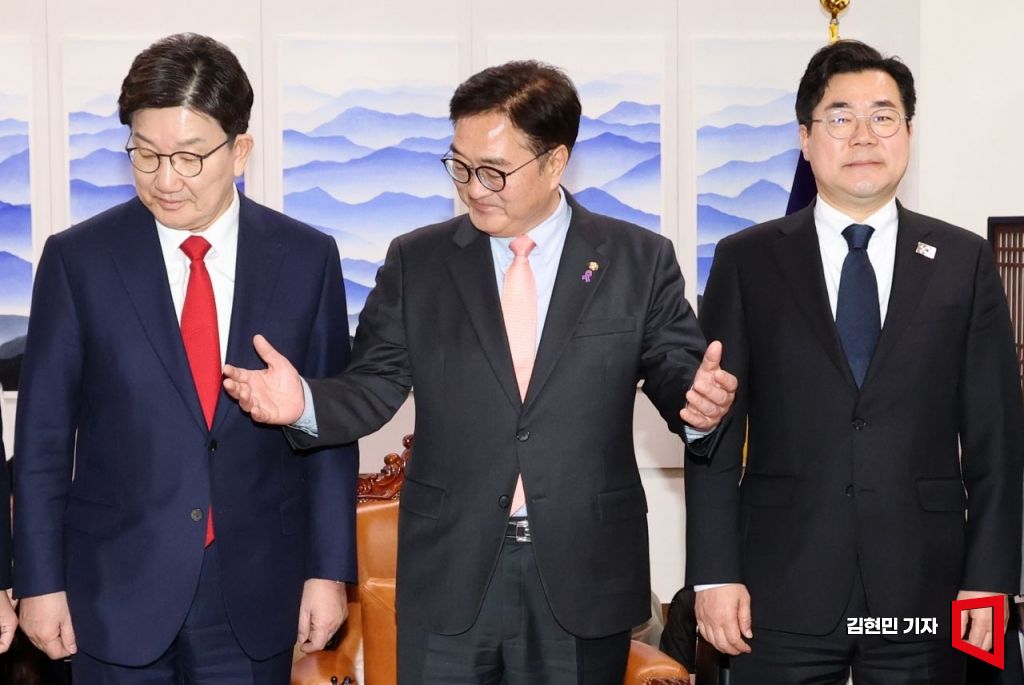 우원식 국회의장이 10일 국회 의장실에서 열린 국정협의회에서 권성동 국민의힘 원내대표(왼쪽)와 박찬대 더불어민주당 원내대표와 기념촬영을 하고 있다.