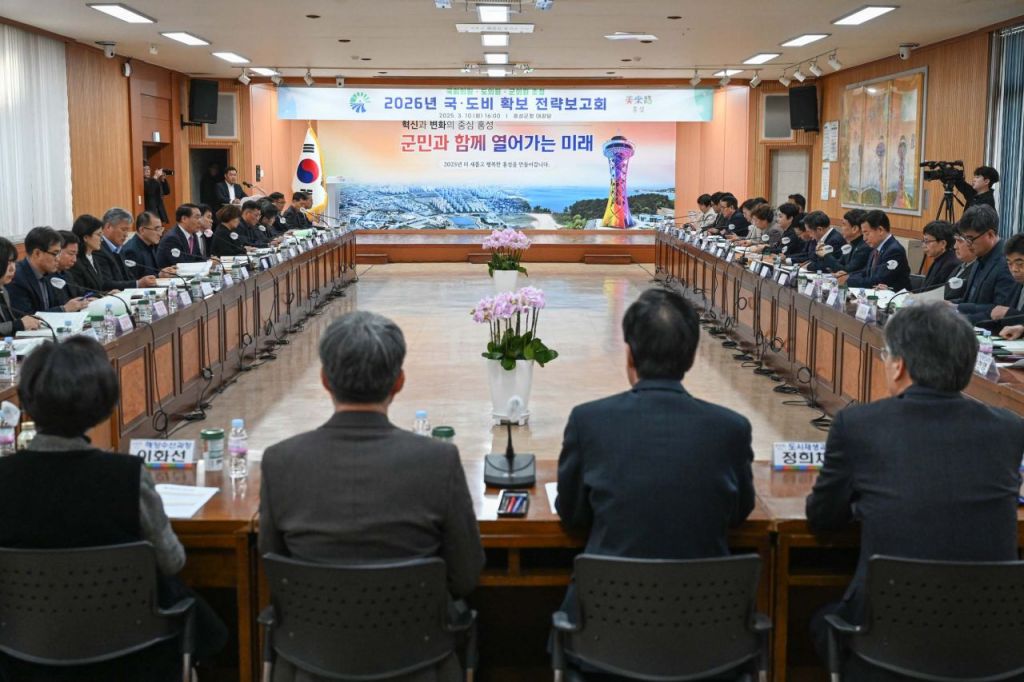 충남 홍성군은 10일 오후 군청 대강당에서 이용록 군수, 강승규 국회의원, 김덕배 의장과 충남도의회 이종화. 이상근 의원 등이 참석한 가운데 새로운 미래 신성장 동력사업의 추진을 위한 2026년 국·도비 확보 전략보고회를 가졌다.