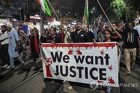 지난해 8월 인도 콜카타의 한 국립병원에서 여성 수련의가 강간 후 살해된 사건에 분노한 시민들이 시위를 벌이고 있다. AP 연합뉴스