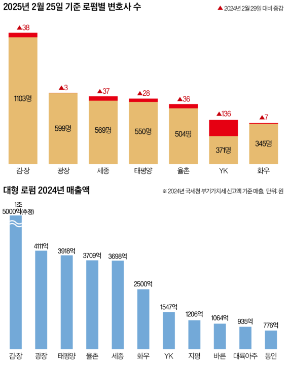 김·장 법률사무소 소속 국내 변호사 수가 1100명을 넘겼다. 2020년 한국 로펌 중 처음으로 국내 변호사 수 1000명을 넘긴 지 5년 만이다. 법무법인 율촌의 변호사 수도 500명을 돌파하면서 상위 5개 로펌이 모두 500명 이상의 국내 변호사를 보유하게 됐다. 전국에 분사무소를 두고 사세를 확장하고 있는 법무법인 YK는 국내 변호사 수로 율촌에 이어 6위에 올랐다.