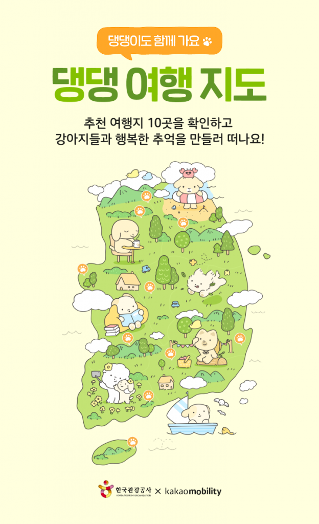 국제 강아지의 날(3월23일)을 맞이해 한국관광공사(공사)와 카카오모빌리티가 반려동물과 함께할 수 있는 봄 추천 여행지 10곳을 담은 ‘댕댕 여행 지도’로 공개했다.