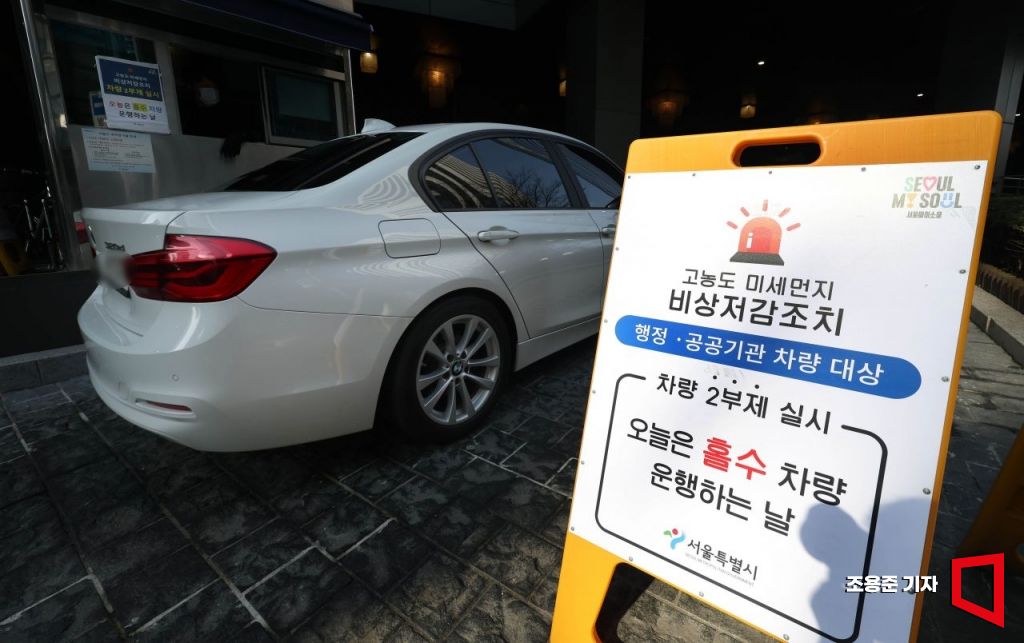 서울을 비롯해 수도권에 초미세먼지가 기승을 부리면서 올봄 들어 처음으로 미세먼지 비상저감조치가 시행된 11일 서울 중구 서울시청 주차장 입구에 차량 2부제 실시 관련 안내문이 붙어 있다.