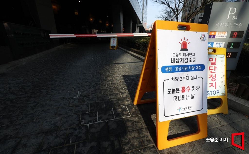 서울을 비롯해 수도권에 초미세먼지가 기승을 부리면서 올봄 들어 처음으로 미세먼지 비상저감조치가 시행된 11일 서울 중구 서울시청 주차장 입구에 차량 2부제 실시 관련 안내문이 붙어 있다.