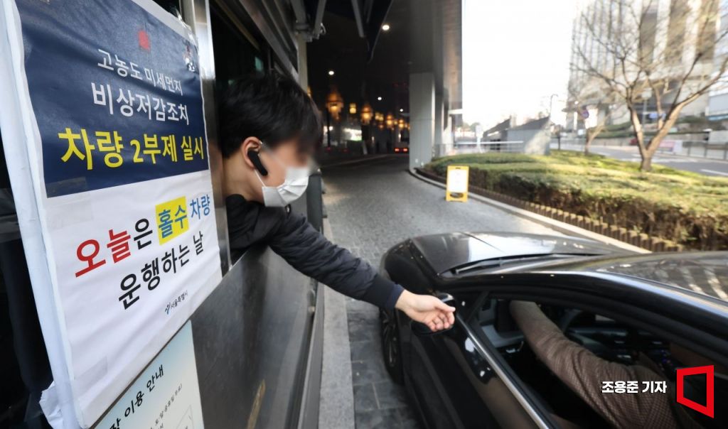 서울을 비롯해 수도권에 초미세먼지가 기승을 부리면서 올봄 들어 처음으로 미세먼지 비상저감조치가 시행된 11일 서울 중구 서울시청 주차장 입구에 차량 2부제 실시 관련 안내문이 붙어 있다.