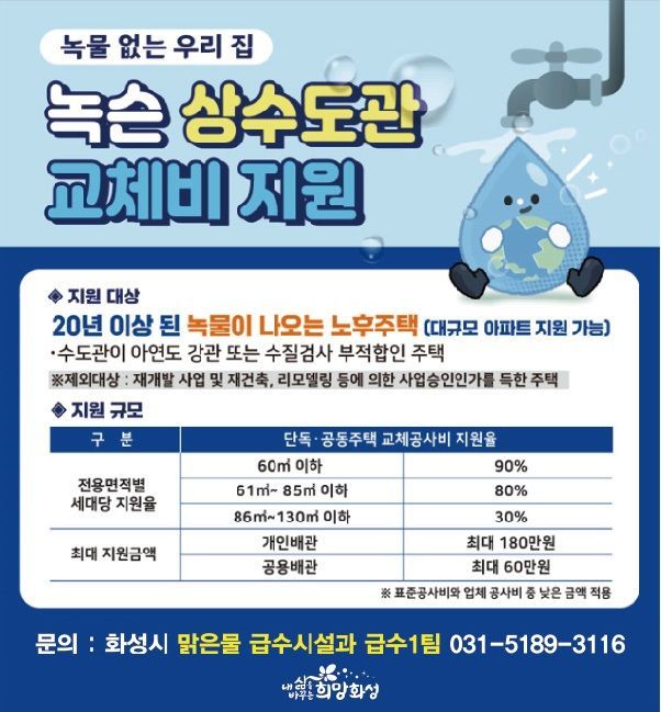 경기도 화성시는 노후 주택을 대상으로 '‘녹물 없는 우리 집 수도관 개량 지원사업'을 시행한다고 11일 밝혔다.