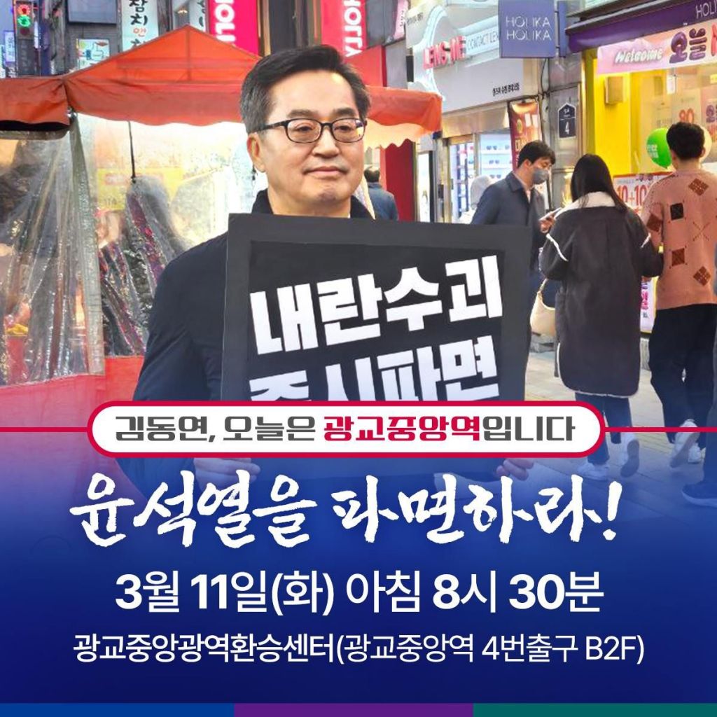 특히 "윤석열의 구속취소로 지금 정치적 불확실성의 안개가 더욱 짙어져 버렸다"며 "우리 경제가 걱정이다. 민생이 걱정이다. 이와 같은 걱정 때문에 어제 퇴근길 수원역에서 그리고 오늘 출근길 광교중앙역에서 1인시위를 통해서 내란수괴의 구속취소 부당함과 조속한 탄핵의 인용을 주장하기 위해서 나왔다"고 덧붙였다.