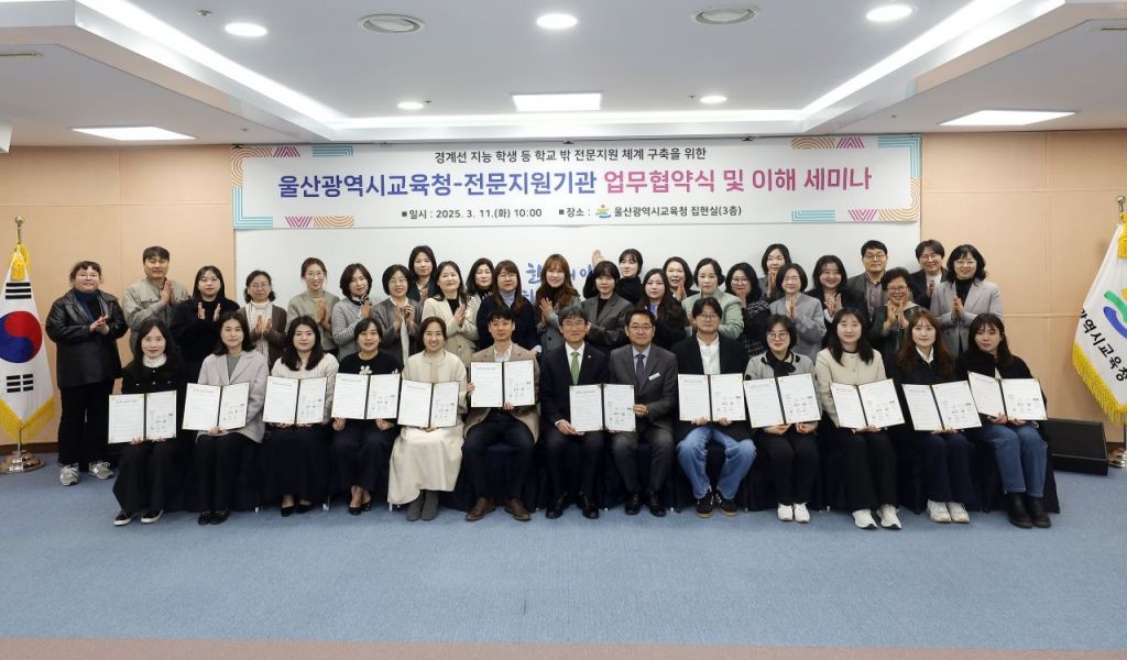 울산교육청은 11일 집현실에서 신규 전문지원기관 11곳과 학교 밖 전문지원 체계 구축, 운영을 내용으로 하는 업무 협약을 체결했다.