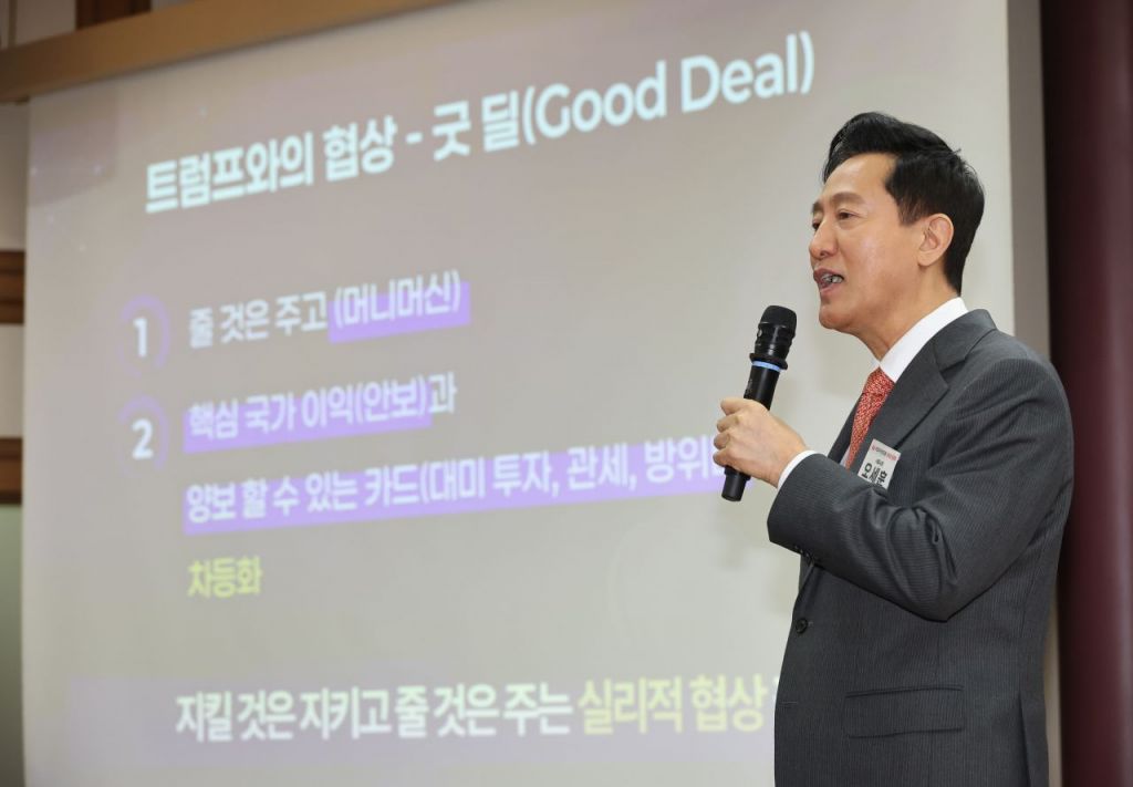 오 시장은 "미국 트럼프 신행정부에 대한민국은 '머니 머신'"이라고 칭했다. 성장한 한국의 국력과 경제력에 맞게 방위비 분담금 등을 일정 수준 더 부담해야 한국도 원하는 '카드'를 내밀 수 있다는 것이다. 오 시장은 "좋은 협상, 즉 '굿 딜'이란 머니머신인 대한민국이 줄 것은 주자(는 것)"라며 "핵심 국가 안보 역량과 관련된 것은 양보할 수 없고, 그 외에 대미 투자나 관세, 방위비는 분담하겠다고 하는 실리적, 거래적인 협상이 필요하다"고 했다.