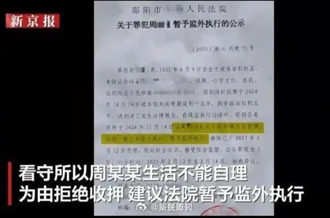 그런데 샤오양현 구치소 측은 한 달 뒤 저우씨가 '스스로 생활할 수 없다'는 이유로 수감을 거부하면서 법원에 임시 석방·관리를 건의했고 법원은 지난달 온라인을 통해 이 같은 건의가 들어왔다고 공개했다.