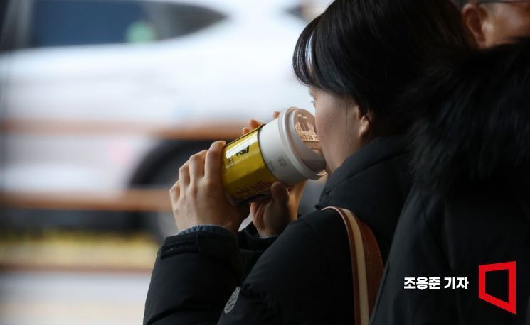 서울 중구 소공동에서 출근길에 나선 한 직장인이 커피를 마시고 있다.