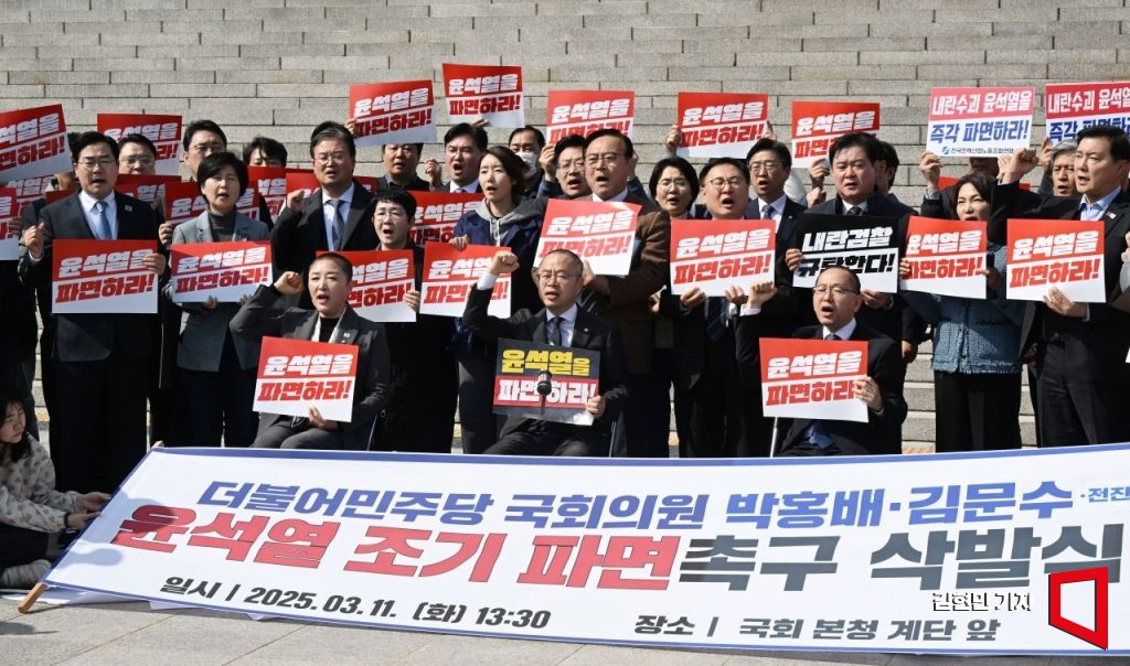 더불어민주당 전진숙(왼쪽부터), 박홍배, 김문수 의원이 11일 국회 본청 앞 계단에서 윤석열 대통령 조기파면 등을 촉구하며 삭발한 뒤 구호를 외치고 있다.