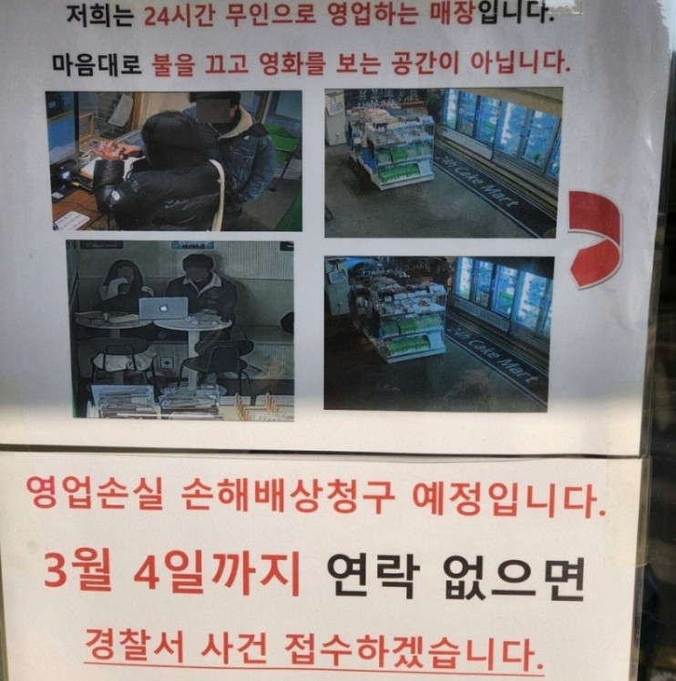 무인 매장 매니저가 붙인 공지문을 보면 "저희는 24시간 무인으로 영업하는 매장입니다. 마음대로 불을 끄고 영화를 보는 공간이 아닙니다"라고 적혀 있었다. 이와 더불어 업주가 공개한 방범 카메라(CCTV) 사진에는 두 남녀가 매장 불을 끄고 노트북으로 영화를 보는 모습이 담겼다. 무인 매장 매니저 측은 "영업손실 손해배상청구 예정이라며 3월 4일까지 연락 없으면 경찰서 사건 접수하겠다"고 적었다.