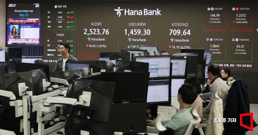 미 트럼프의 경기침체 용인에 따른 공포심리 확산이 커지면서 나스닥이 폭락하며 코스피가 하락 출발한 11일 서울 중구 하나은행 본점 딜링룸 현황판에 코스피 지수 등이 표시되고 있다. 이날 코스피는 전 거래일보다 코스피 53.70p(2.09%) 내린 2516.69로 장을 시작했다. 2025.3.11 조용준 기자