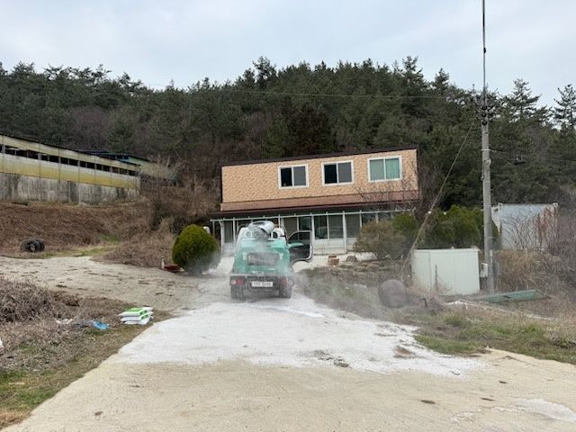 전남 해남군이 소 집단 폐사 축사 주변으로 소독 등을 진행하고 있는 모습. 해남군 제공