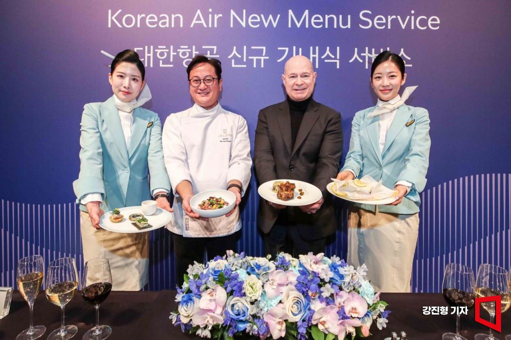 대한항공은 11일 신규 기업 이미지(CI) 론칭에 앞서 기내식 신메뉴를 소개했다. 이번 신메뉴는 서울 한남동 파인다이닝 레스토랑 'Cesta'의 김세경 오너 셰프와 협업해 개발했다. 김 셰프는 "신선한 제철 식자재와 다양한 조리법을 사용한 고급 파인다이닝을 하늘에서도 즐길 수 있게 한 점이 특징"이라고 했다.