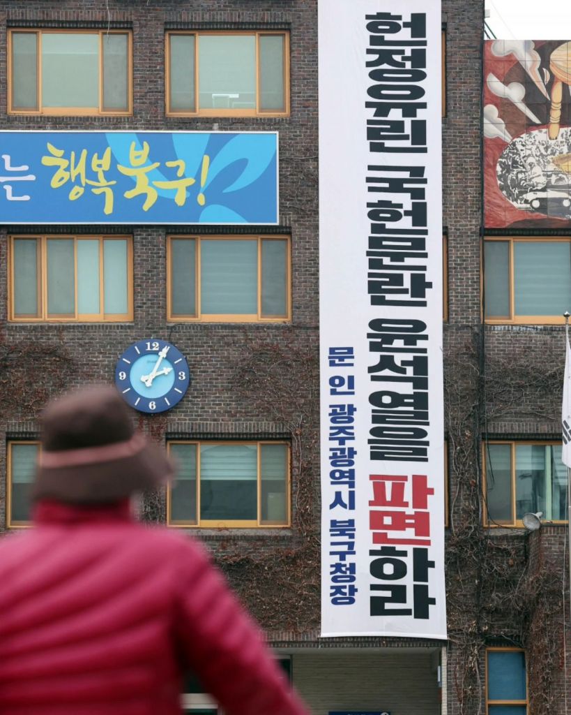 11일 광주 북구와 정치권 등에 따르면 문 구청장은 전날 청사 외벽에 "헌정 유린 국헌문란 윤석열을 파면하라"는 문구가 적힌 현수막을 게시했다. 개인의 정치적 신념을 드러내는 동시에 윤 대통령의 사면을 주도한 검찰을 비판하는 글을 SNS에 올리며 입장을 분명히 했다.